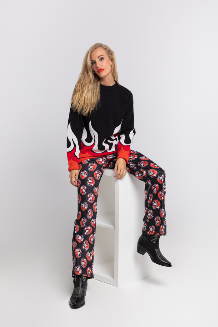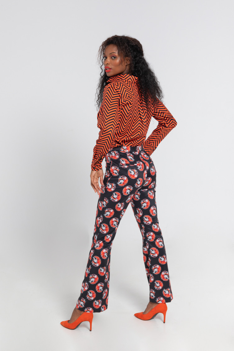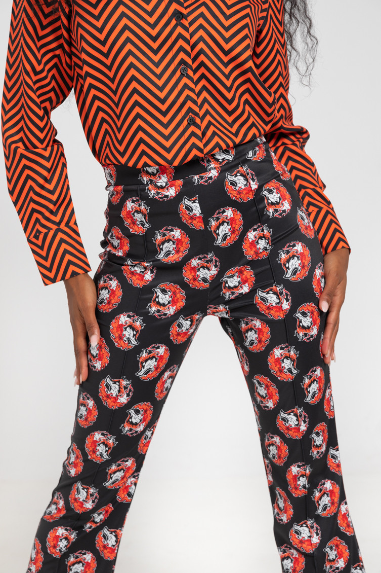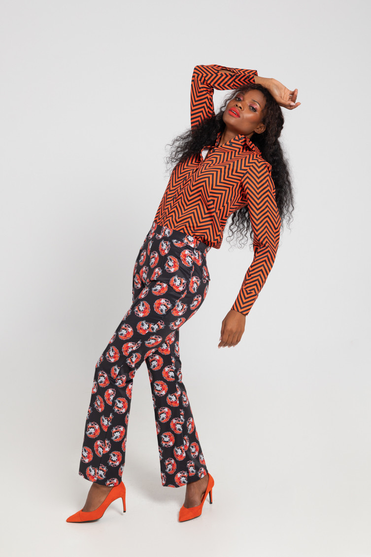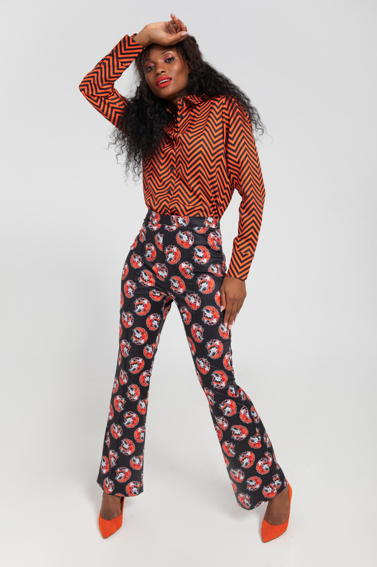 "Keeping me warm" collection, which advocates for respect towards empowered women, sometimes called FOXY - High-waisted trousers made of fluid fabric with a structured fit and vector print. Finished with a flared cut at the bottom. Side closure with invisible zipper. Welt pockets at the back. - The model is 1.70 m tall and wears size S. - 100% polyester - Machine wash in cold water. Do not bleach. Do not tumble dry. Dry hanging in the shade. Iron at low temperature, below 100 ºC. Iron inside out, do not let the iron stand still on the garment. Wash with similar colours.