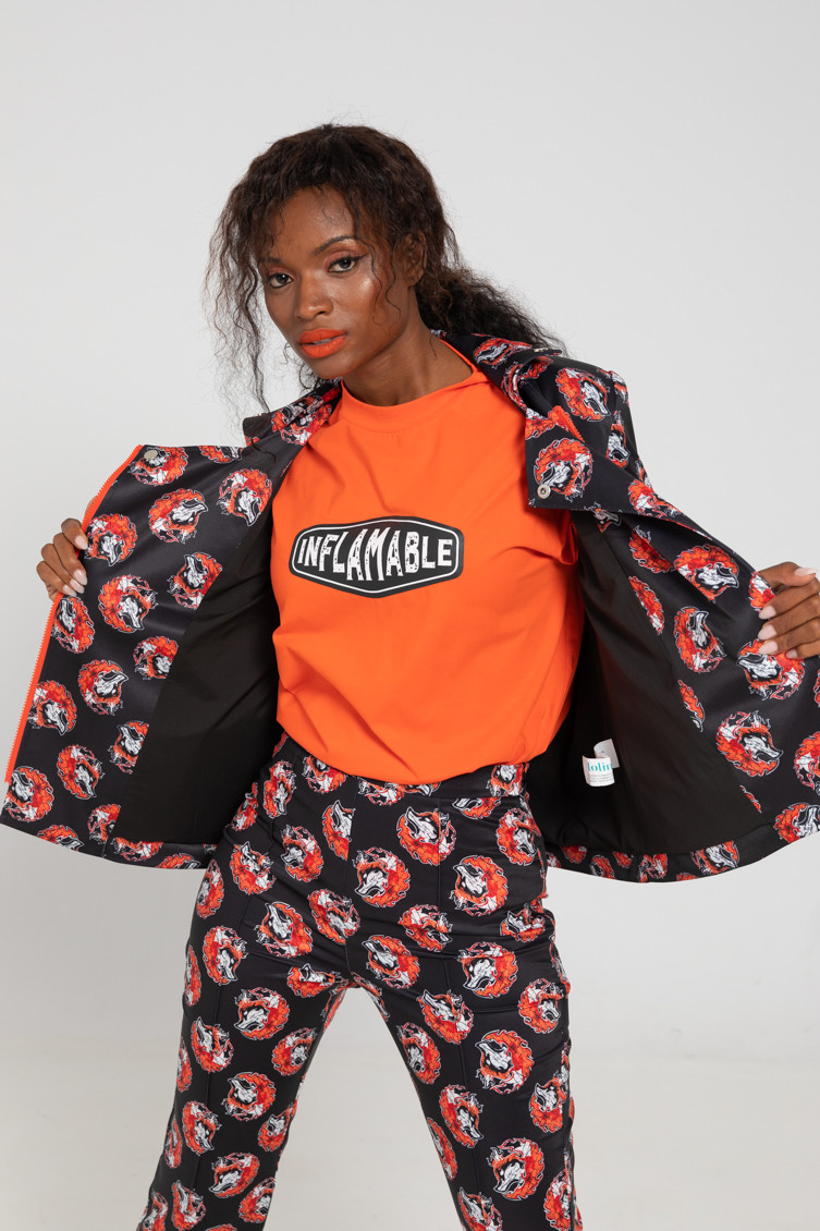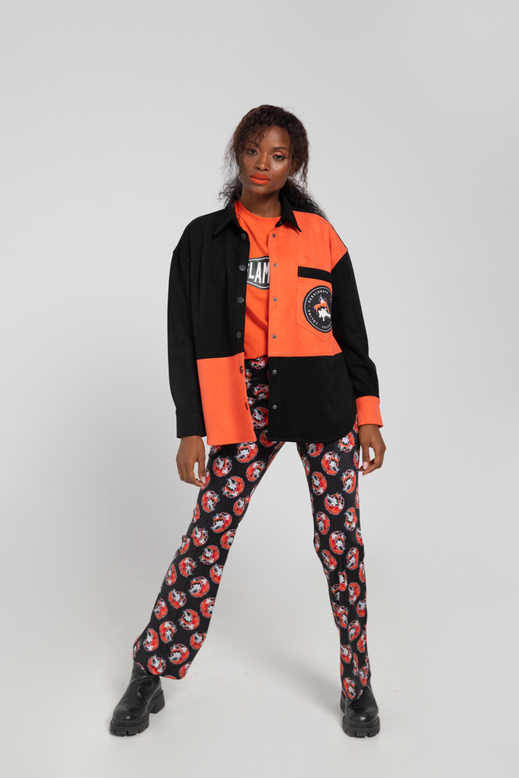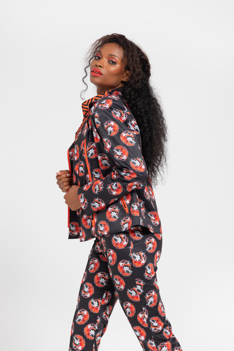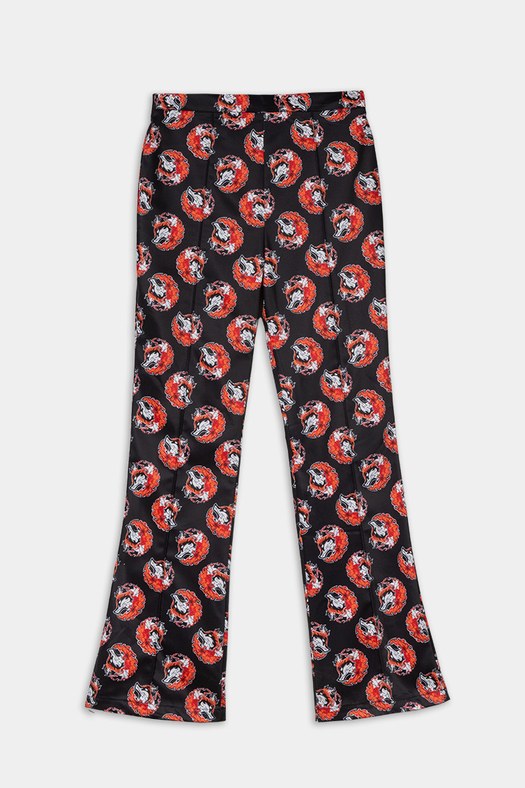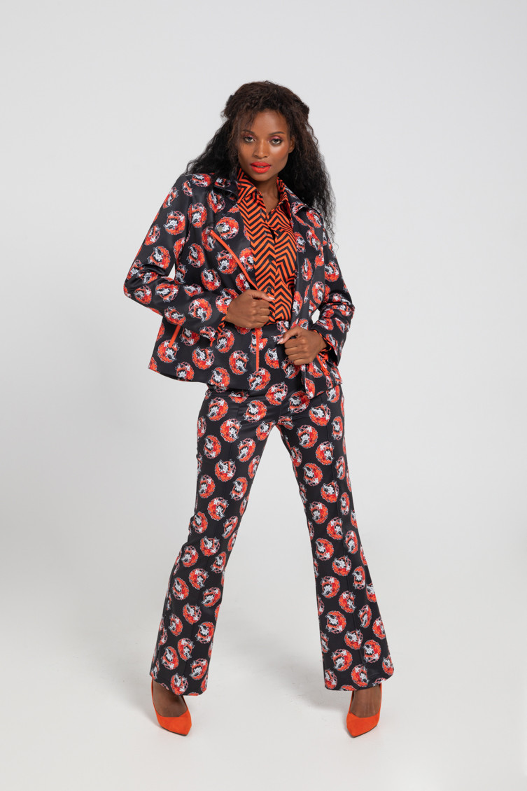 "Keeping me warm" collection, which advocates for respect towards empowered women, sometimes called FOXY - High-waisted trousers made of fluid fabric with a structured fit and vector print. Finished with a flared cut at the bottom. Side closure with invisible zipper. Welt pockets at the back. - The model is 1.70 m tall and wears size S. - 100% polyester - Machine wash in cold water. Do not bleach. Do not tumble dry. Dry hanging in the shade. Iron at low temperature, below 100 ºC. Iron inside out, do not let the iron stand still on the garment. Wash with similar colours.