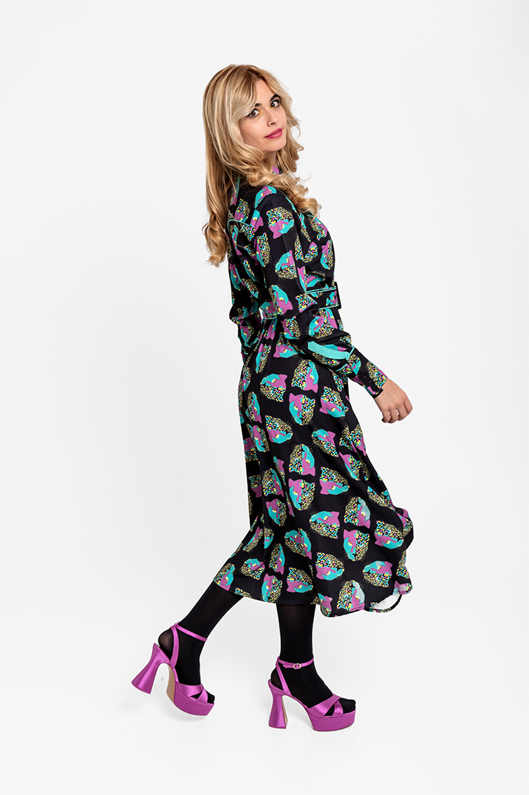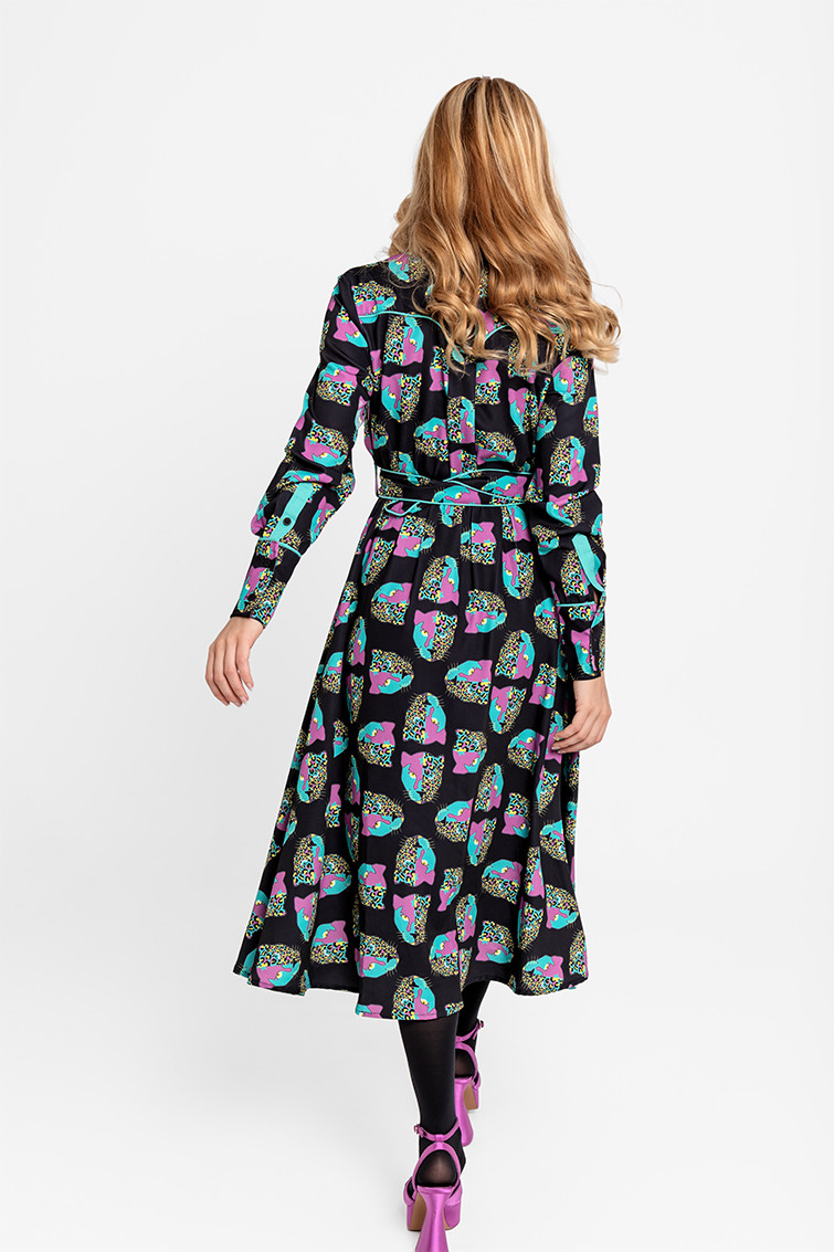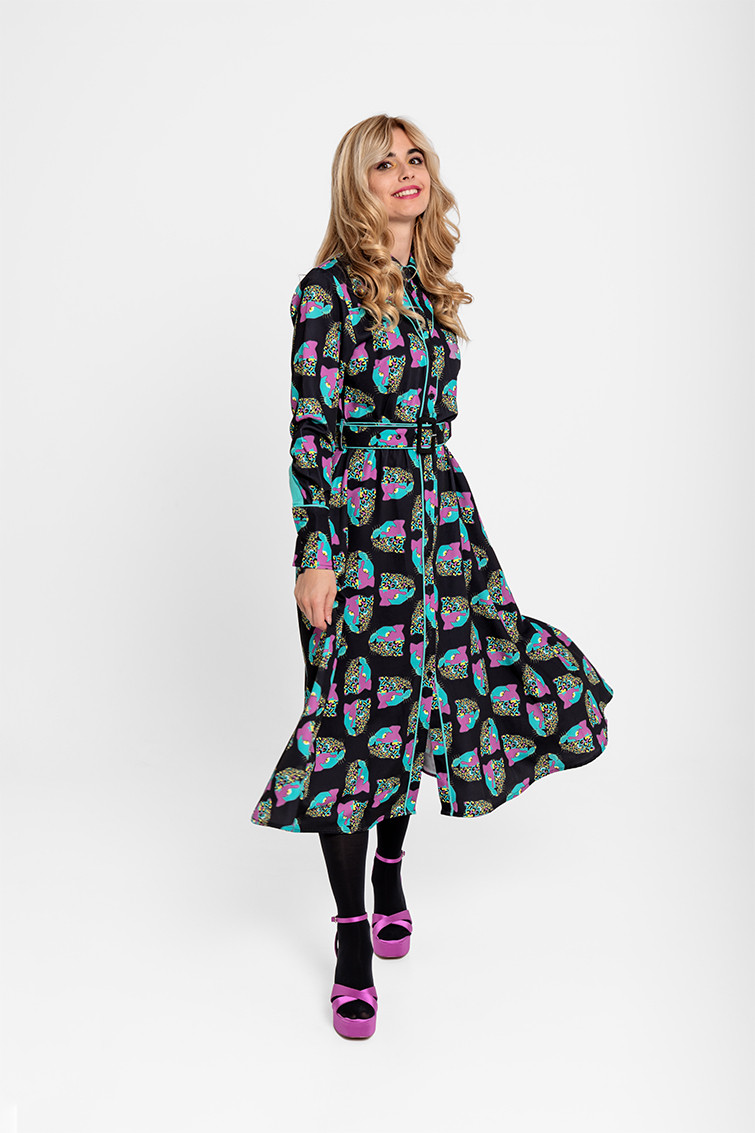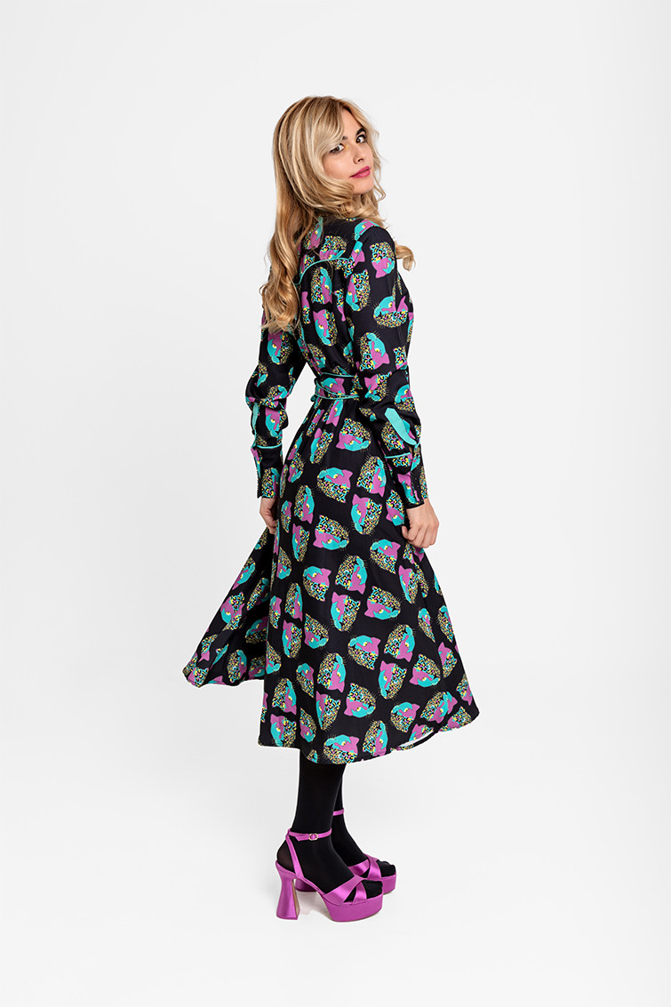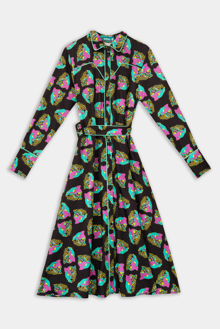 "SUPERSTAR", I always dreamed of being a Superstar Panther. - Midi shirtdress made of fluid fabric with a cowboy-style bodice and vector print. Central button placket, elastic waistband with adjustable fabric belt. Invisible pockets on the sides. - Chest measurements 44 cm, waist 31 cm-43 cm, hips 62 cm, total length 116.5 cm - 100% Polyester. - Machine wash in cold water. Do not bleach. Do not tumble dry. Dry hanging in the shade. Iron at low temperature, below 100 ºC. Iron inside out. Do not leave the iron on the garment. Wash with similar colours.