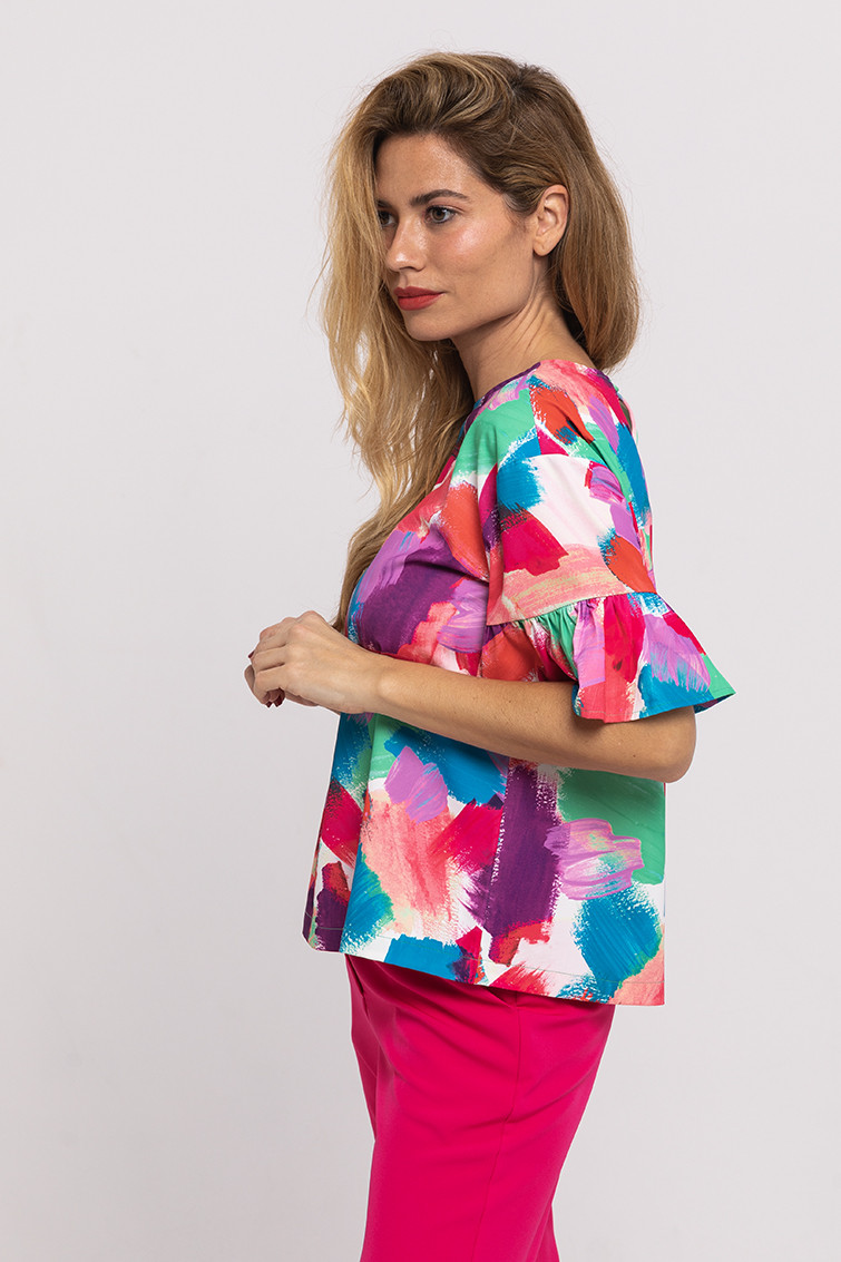 Sometimes I don't water it,... but when I bloom, I fill everything with colours. - Straight-cut blouse, fluid fabric, short sleeves with ruffle detail. - 100% Polyester. - Machine wash in cold water. Do not bleach. Do not tumble dry. Dry hanging in the shade. Iron at low temperature, below 100 ºC. Iron inside out, do not leave the iron on the garment. Wash with similar colours.