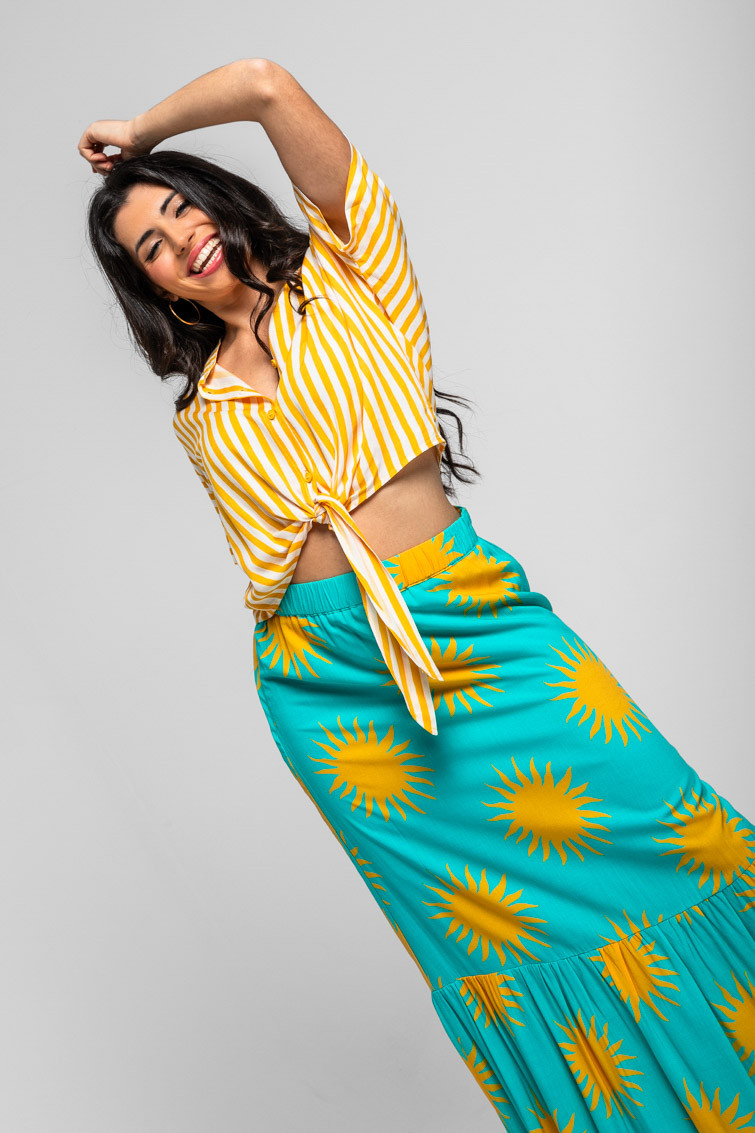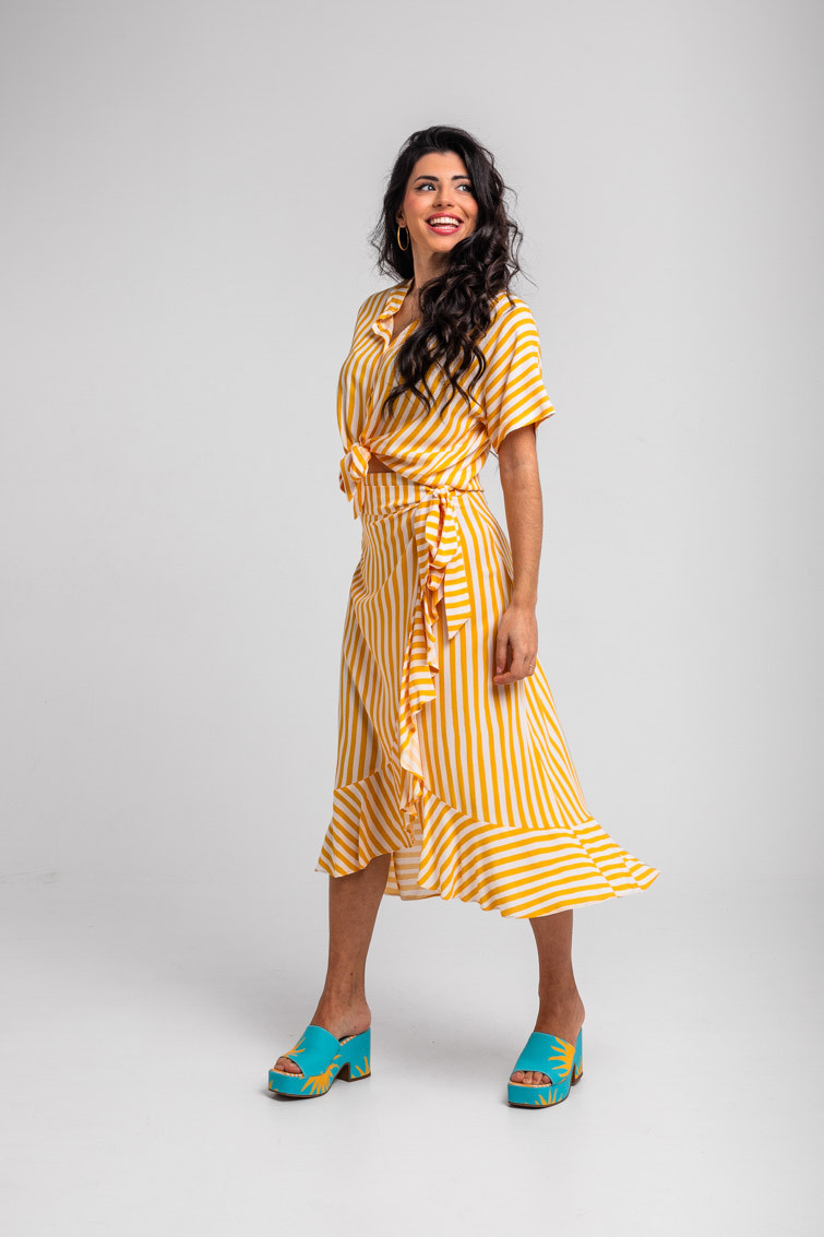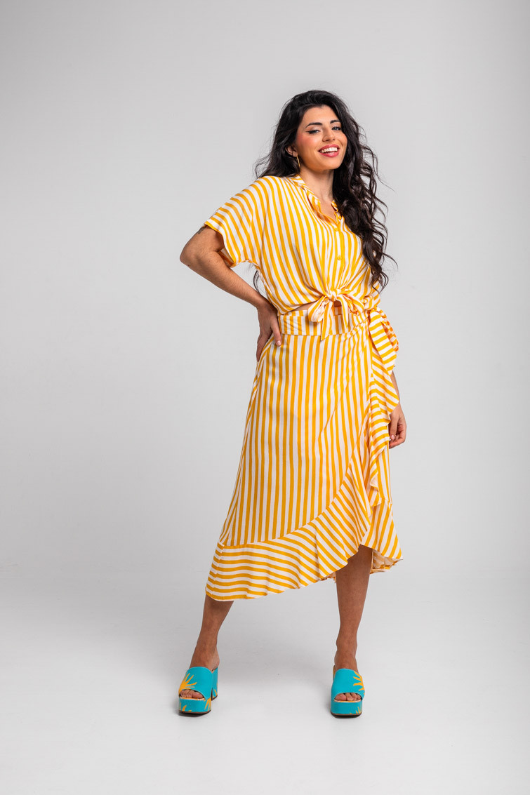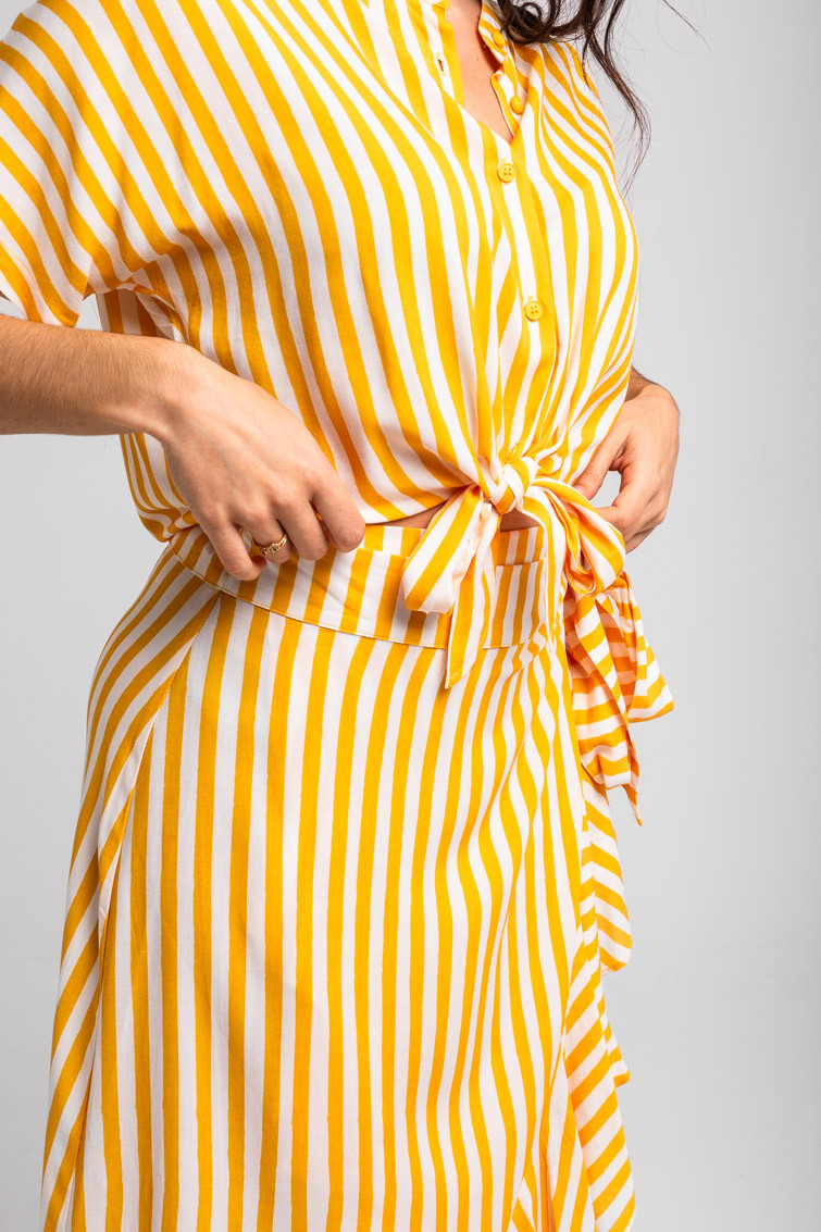 Oh Sole mio: sol, solito, calientame un poquito - Camisa cuello mao anudada de rayas blancas y amarillas: Camisa de manga corta tipo murciélago con cierre frontal de botones y cuello mao. Diseño que se puede hacer más crop mediante un nudo en el delantero a la altura del bajo. Corte amplio y relajado. - 100% Viscosa. - Lavar a máquina en agua fría en centrifugado corto. No usar blanqueador. No usar secadora. Secar colgado a la sombra. Planchado a temperatura baja, por debajo de 100 ºC. Planchar del revés. No dejar la plancha parada sobre la prenda. Lavar con colores similares. - TALLA XS: Medida de pecho 55 cm, medida del bajo 48 cm y largo del cuerpo 48,5 cm. TALLA S: Medida de pecho 57 cm, medida del bajo 50 cm y largo del cuerpo 50 cm. TALLA M: Medida de pecho 59 cm, medida del bajo 52 cm y largo del cuerpo 51,5 cm. TALLA L: Medida de pecho 61 cm, medida del bajo 54 cm y largo del cuerpo 53 cm. TALLA XL: Medida de pecho 63 cm, medida del bajo 56 cm y largo del cuerpo 54,5 cm. TALLA XXL: Medida de pecho 65 cm, medida del bajo 58 cm y largo del cuerpo 56 cm. - Las medidas de las prendas pueden presentar pequeñas variaciones debido al proceso de producción de hasta 2 cm. - Lolina ha realizado un gran esfuerzo para mostrar los colores de las prendas de la forma más cercana a la realidad posible. No obstante, queremos que tengas en cuenta que el color de las prendas que aparecen en pantalla puede estar sujeto a variaciones dependiendo de la calidad de tu ordenador o smartphone.