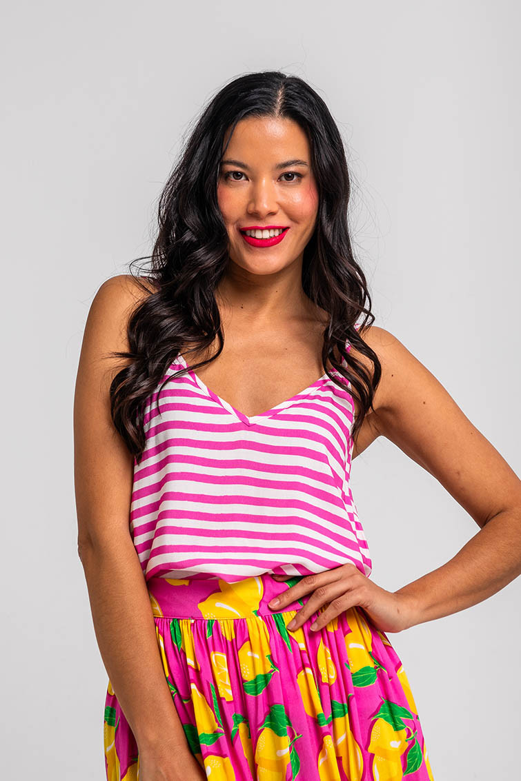Limoncello: ácido, rico y cargadito - Blusa lencera de rayas blancas y rosas: Blusa lencera de tejido fluido elástico, encaje en escote y tirantes ajustables. - 100% Viscosa. - Lavar a máquina en agua fría en centrifugado corto. No usar blanqueador. No usar secadora. Secar colgado a la sombra. Planchado a temperatura baja, por debajo de 100 ºC. Planchar del revés. No dejar la plancha parada sobre la prenda. Lavar con colores similares. - TALLA XS: Medidas de pecho 43 cm, ancho de prenda 52 cm y largo 34,5 cm. TALLA S: Medidas de pecho 45 cm, ancho de prenda 54 cm y largo 36 cm. TALLA M: Medidas de pecho 47 cm, ancho de prenda 56 cm y largo 37,5 cm. TALLA L: Medidas de pecho 49 cm, ancho de prenda 58 cm y largo 39 cm. TALLA XL: Medidas de pecho 51 cm, ancho de prenda 60 cm y largo 40,5 cm. - Las medidas de las prendas pueden presentar pequeñas variaciones debido al proceso de producción de hasta 2 cm. - Lolina ha realizado un gran esfuerzo para mostrar los colores de las prendas de la forma más cercana a la realidad posible. No obstante, queremos que tengas en cuenta que el color de las prendas que aparecen en pantalla puede estar sujeto a variaciones dependiendo de la calidad de tu ordenador o smartphone.