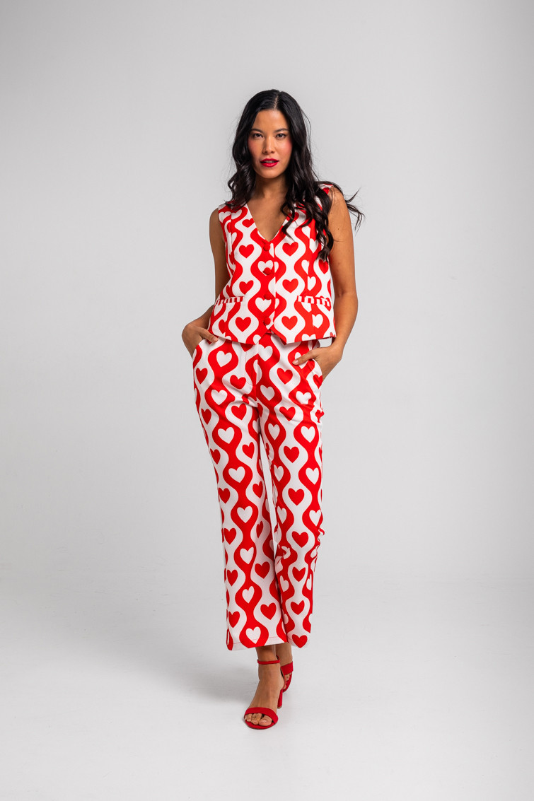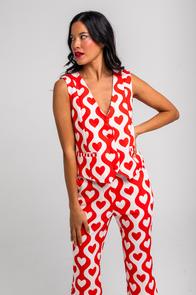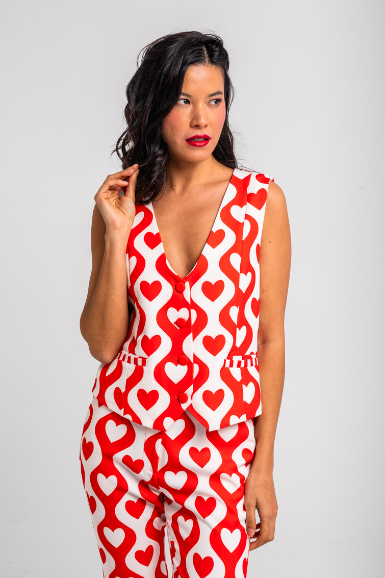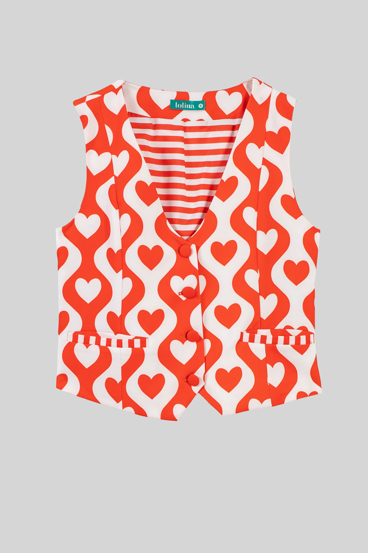 More amor por favor: por que hace falta más amor en el mundo - Chaleco Sastre de corazones y ondas blanco y rojo: Chaleco corto con escote de pico, cierre de botones y costuras moldeadoras delante. Forrado. - 100% Poliéster. - Lavar a máquina en agua fría. No usar blanqueador. No usar secadora. Secar colgado a la sombra. Planchado a temperatura baja, por debajo de 100 ºC. Planchar del revés. No dejar la plancha parada sobre la prenda. Lavar con colores similares. - TALLA XS: Medida de pecho 44 cm, medida del bajo 49 cm y largo del cuerpo 71 cm. TALLA S: Medida de pecho 46 cm, medida del bajo 51 cm y largo del cuerpo 72,5 cm. TALLA M: Medida de pecho 48 cm, medida del bajo 53 cm y largo del cuerpo 74 cm. TALLA L: Medida de pecho 50 cm, medida del bajo 55 cm y largo del cuerpo 75,5 cm. TALLA XL: Medida de pecho 52 cm, medida del bajo 57 cm y largo del cuerpo 77 cm. - Las medidas de las prendas pueden presentar pequeñas variaciones debido al proceso de producción de hasta 2 cm. - Lolina ha realizado un gran esfuerzo para mostrar los colores de las prendas de la forma más cercana a la realidad posible. No obstante, queremos que tengas en cuenta que el color de las prendas que aparecen en pantalla puede estar sujeto a variaciones dependiendo de la calidad de tu ordenador o smartphone.