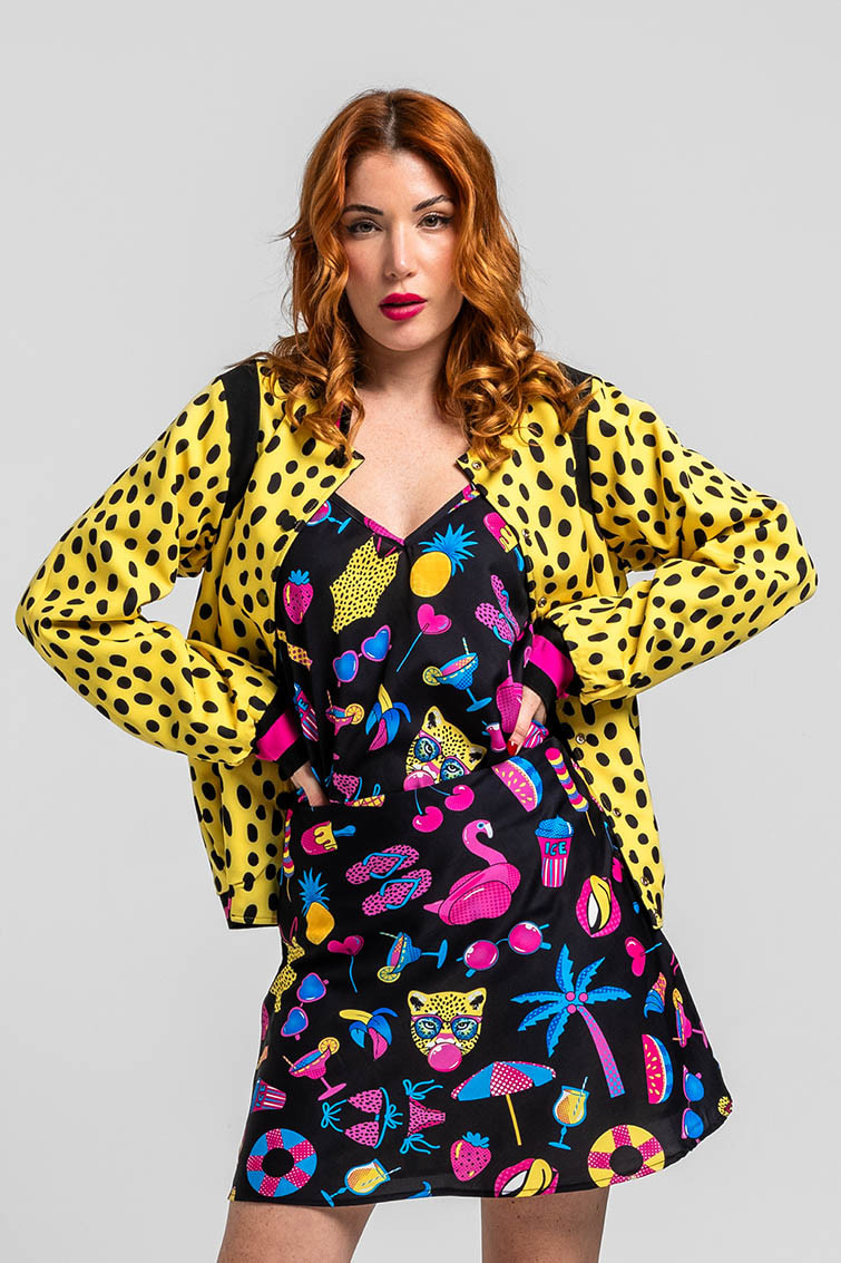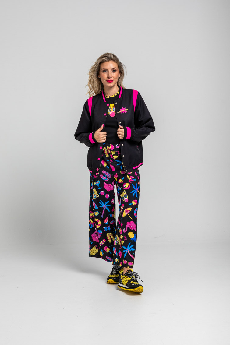 Let’s go to the beach: vamos a la playa oh oh oh!! - Bomber Reversible negra y animal print amarillo y negro: Chaqueta bomber en tejido con cuerpo, reversible, de estampado vectorial en ambas caras, gomas en cuello, cintura y puños. Cierre con cremallera central. Bolsillos laterales en cintura - 100% Poliéster. - Lavar a máquina en agua fría. No usar blanqueador. No usar secadora. Secar colgado a la sombra. Planchado a temperatura baja, por debajo de 100 ºC. Planchar del revés. No dejar la plancha parada sobre la prenda. Lavar con colores similares. - TALLA XS: Medida de pecho 50 cm, medida del bajo 47.5 cm y largo del cuerpo 61.5 cm.TALLA S: Medida de pecho 52 cm, medida del bajo 49.5 cm y largo del cuerpo 63 cm.TALLA M: Medida de pecho 54 cm, medida del bajo 51.5 cm y largo del cuerpo 64.5 cm.TALLA L: Medida de pecho 56 cm, medida del bajo 53.5 cm y largo del cuerpo 66 cm.TALLA XL: Medida de pecho 58 cm, medida del bajo 55.5 cm y largo del cuerpo 67.5 cm TALLA XXL:Medida de pecho 60 cm, medida del bajo 57.5 cm y largo del cuerpo 69 cm - Las medidas de las prendas pueden presentar pequeñas variaciones debido al proceso de producción de hasta 2 cm. - Lolina ha realizado un gran esfuerzo para mostrar los colores de las prendas de la forma más cercana a la realidad posible. No obstante, queremos que tengas en cuenta que el color de las prendas que aparecen en pantalla puede estar sujeto a variaciones dependiendo de la calidad de tu ordenador o smartphone.