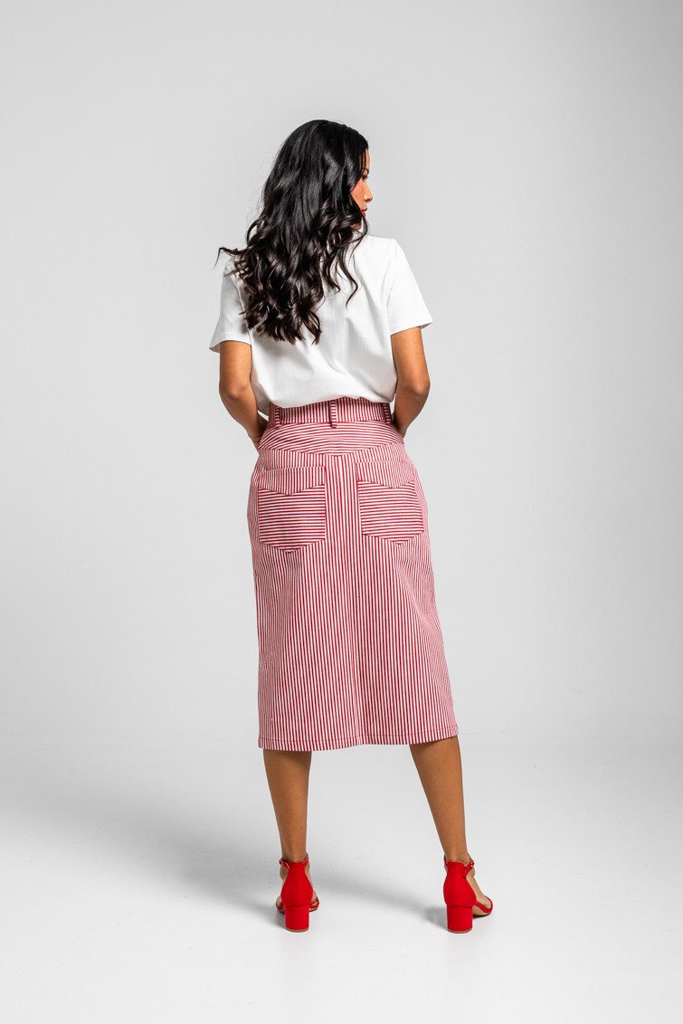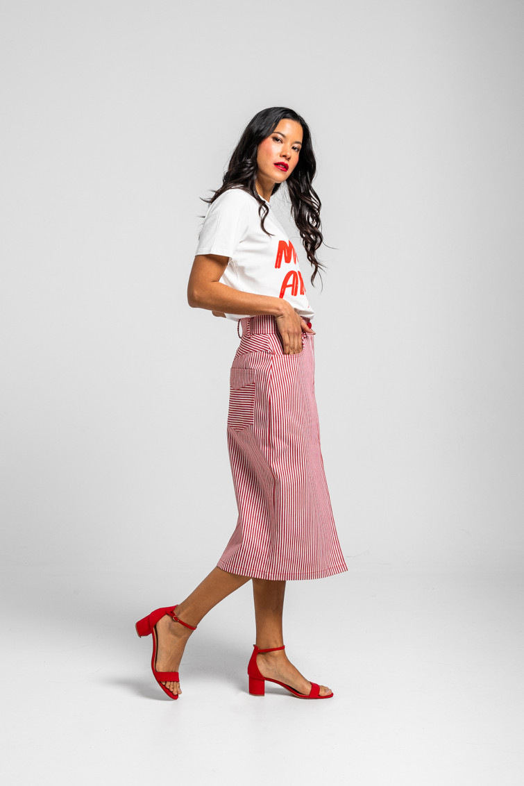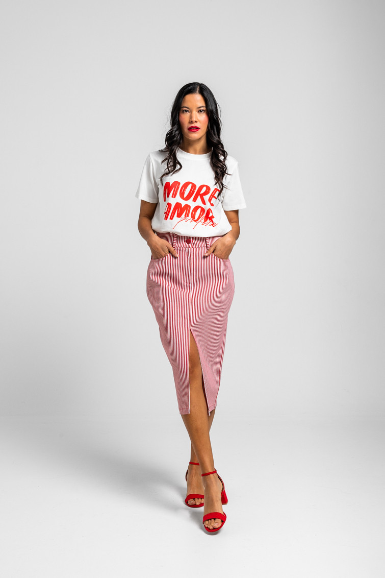 More amor por favor: por que hace falta más amor en el mundo - Falda Midi Jeans de rayas blanco y rojo: Falda midi con bolsillos y raja central delantera. Modelo de talle alto con cierre de cremallera con botón. - 100% Algodón. - Lavar a máquina en agua fría. No usar blanqueador. No usar secadora. Secar colgado a la sombra. Planchado a temperatura baja, por debajo de 100 ºC. Planchar del revés. No dejar la plancha parada sobre la prenda. Lavar con colores similares. - TALLA XS: Medidas de cintura 34 cm, cadera 46 cm y largo 74,5 cm. TALLA S: Medidas de cintura 36 cm, cadera 48 cm y largo 76 cm. TALLA M: Medidas de cintura 38 cm, cadera 50 cm y largo 77,5 cm. TALLA L: Medidas de cintura 40 cm, cadera 52 cm y largo 79 cm. TALLA XL: Medidas de cintura 42 cm, cadera 54 cm y largo 80,5 cm. - Las medidas de las prendas pueden presentar pequeñas variaciones debido al proceso de producción de hasta 2 cm. - Lolina ha realizado un gran esfuerzo para mostrar los colores de las prendas de la forma más cercana a la realidad posible. No obstante, queremos que tengas en cuenta que el color de las prendas que aparecen en pantalla puede estar sujeto a variaciones dependiendo de la calidad de tu ordenador o smartphone.
