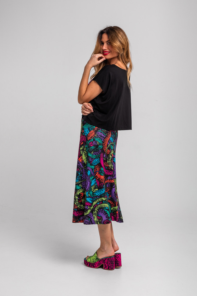 Veneno: dicen que tengo veneno en la piel - Falda Evasé Midi de serpientes: Falda midi de tejido fluido con cuerpo de corte evasé. Cremallera lateral invisible y con forro. - 95% Poliéster y 5% Elastán. - Lavar a máquina en agua fría. No usar blanqueador. No usar secadora. Secar colgado a la sombra. Planchado a temperatura baja, por debajo de 100 ºC. Planchar del revés. No dejar la plancha parada sobre la prenda. Lavar con colores similares. - TALLA XS: Medidas de cintura 34 cm, cadera 48 cm y largo 76,5 cm. TALLA S: Medidas de cintura 36 cm, cadera 50 cm y largo 78 cm. TALLA M: Medidas de cintura 38 cm, cadera 52 cm y largo 79,5 cm. TALLA L: Medidas de cintura 40 cm, cadera 54 cm y largo 81 cm. TALLA XL: Medidas de cintura 42 cm, cadera 56 cm y largo 82,5 cm. - Las medidas de las prendas pueden presentar pequeñas variaciones debido al proceso de producción de hasta 2 cm. - Lolina ha realizado un gran esfuerzo para mostrar los colores de las prendas de la forma más cercana a la realidad posible. No obstante, queremos que tengas en cuenta que el color de las prendas que aparecen en pantalla puede estar sujeto a variaciones dependiendo de la calidad de tu ordenador o smartphone.