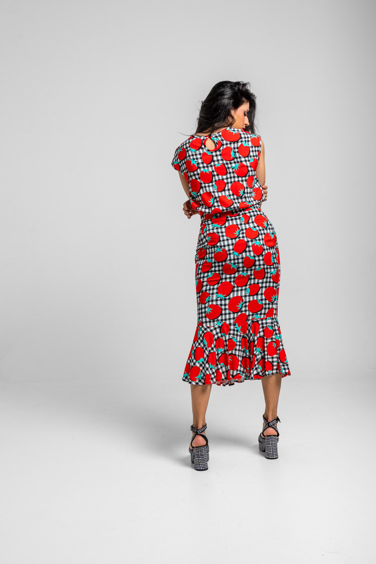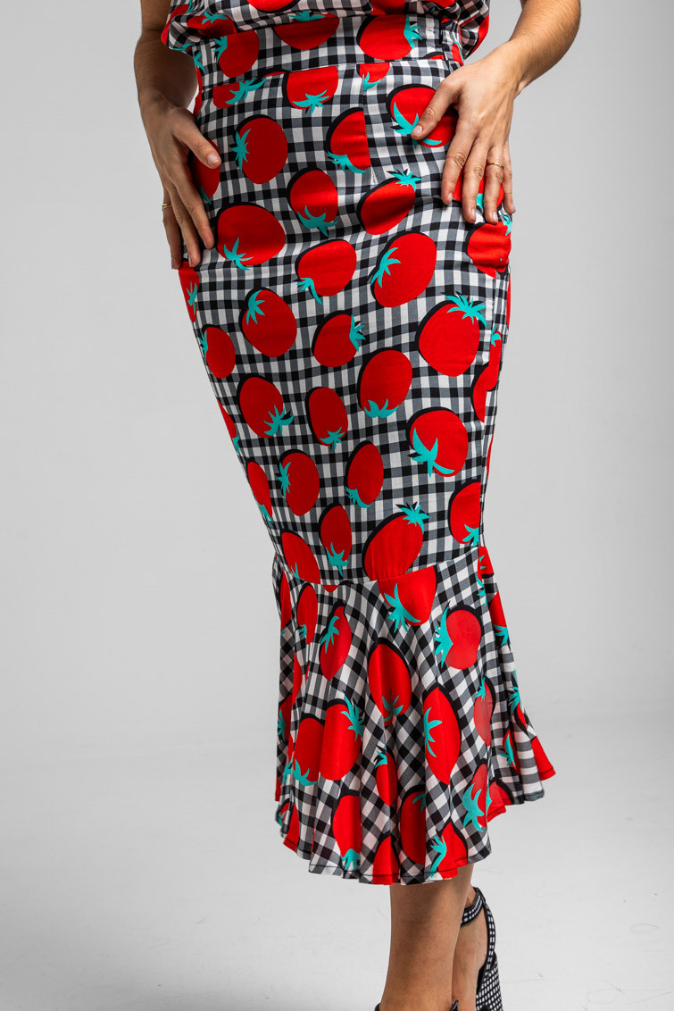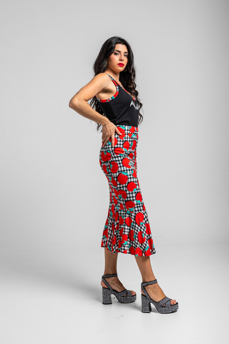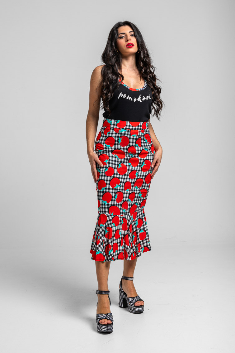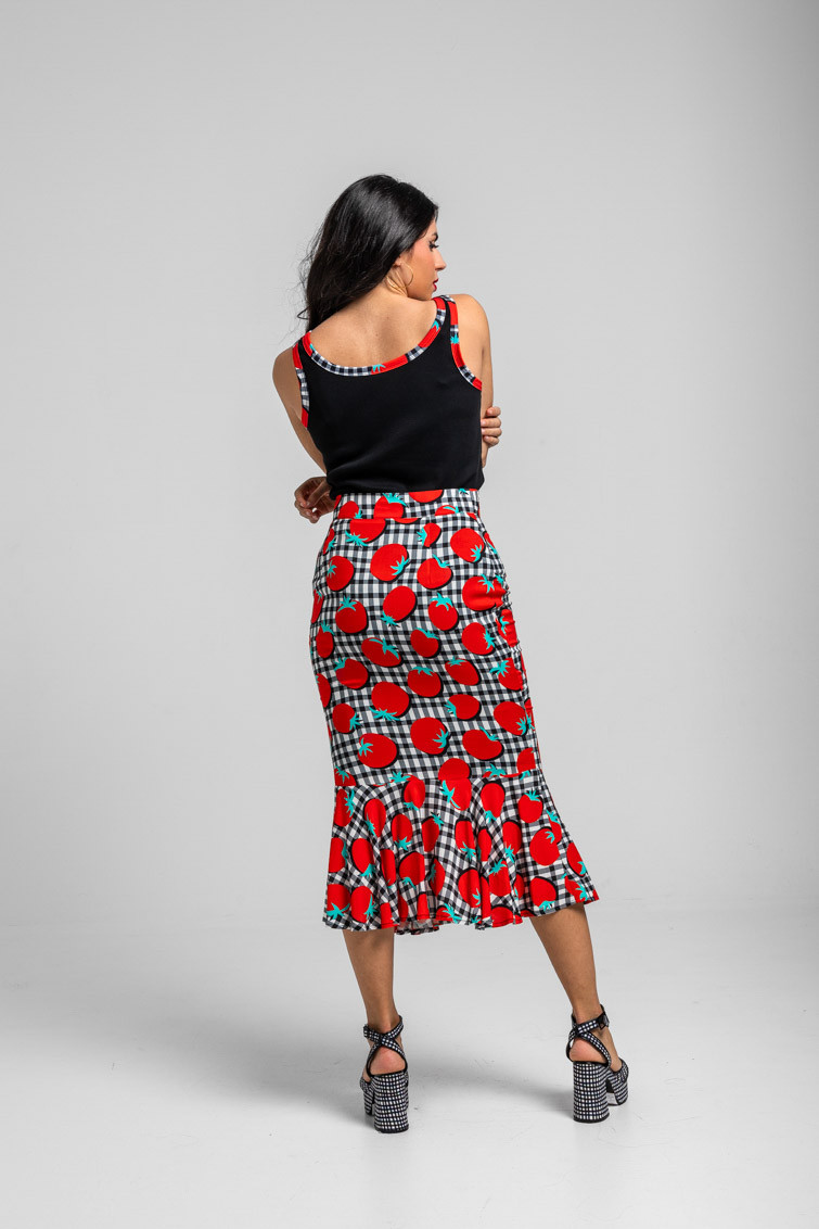 Pomodori: toma tomate - Falda lápiz con godet en el bajo de tomates y vichi blanco y negro: Falda de silueta lápiz, ajustada al cuerpo hasta la rodilla, donde se añade un godet amplio que aporta volumen y movimiento. Pretina a la cintura y pinzas que definen la forma. - 100% Viscosa. - Lavar a máquina en agua fría en centrifugado corto. No usar blanqueador. No usar secadora. Secar colgado a la sombra. Planchado a temperatura baja, por debajo de 100 ºC. Planchar del revés. No dejar la plancha parada sobre la prenda. Lavar con colores similares. - TALLA XS: Medida de la cintura 35 cm, medida de la cadera 47 cm y largo del cuerpo 81,5 cm.TALLA S: Medida de la cintura 37 cm, medida de la cadera 49 cm y largo del cuerpo 83 cm.TALLA M: Medida de la cintura 39 cm, medida de la cadera 51 cm y largo del cuerpo 84,5 cm.TALLA L: Medida de la cintura 41 cm, medida de la cadera 53 cm y largo del cuerpo 86 cm.TALLA XL: Medida de la cintura 43 cm, medida de la cadera 55 cm y largo del cuerpo 87,5 cm.TALLA XXL: Medida de la cintura 45 cm, medida de la cadera 57 cm y largo del cuerpo 89 cm. - Las medidas de las prendas pueden presentar pequeñas variaciones debido al proceso de producción de hasta 2 cm. - Lolina ha realizado un gran esfuerzo para mostrar los colores de las prendas de la forma más cercana a la realidad posible. No obstante, queremos que tengas en cuenta que el color de las prendas que aparecen en pantalla puede estar sujeto a variaciones dependiendo de la calidad de tu ordenador o smartphone.