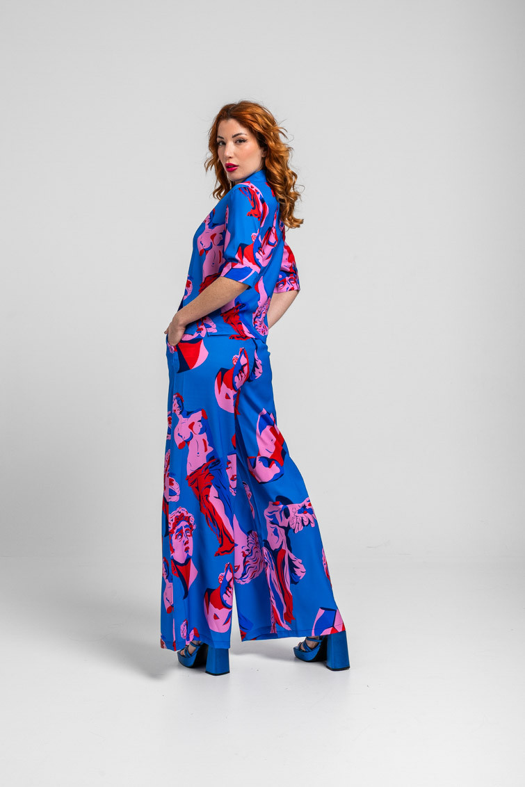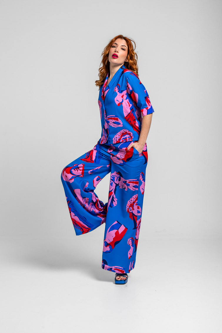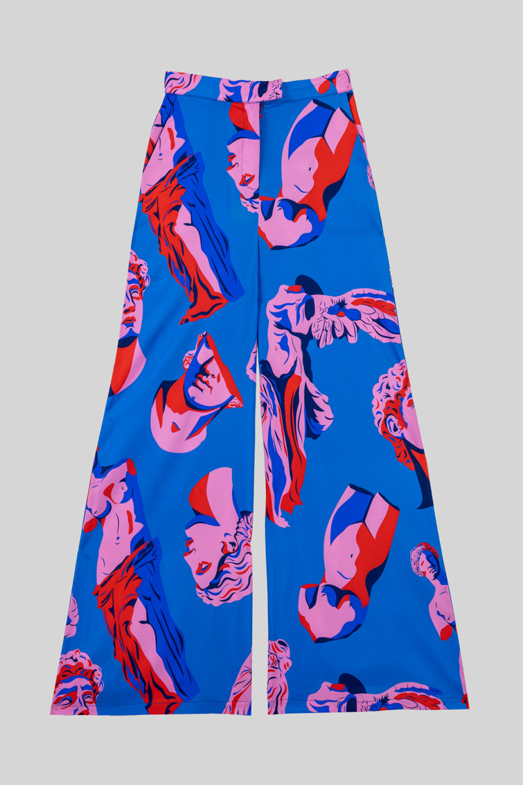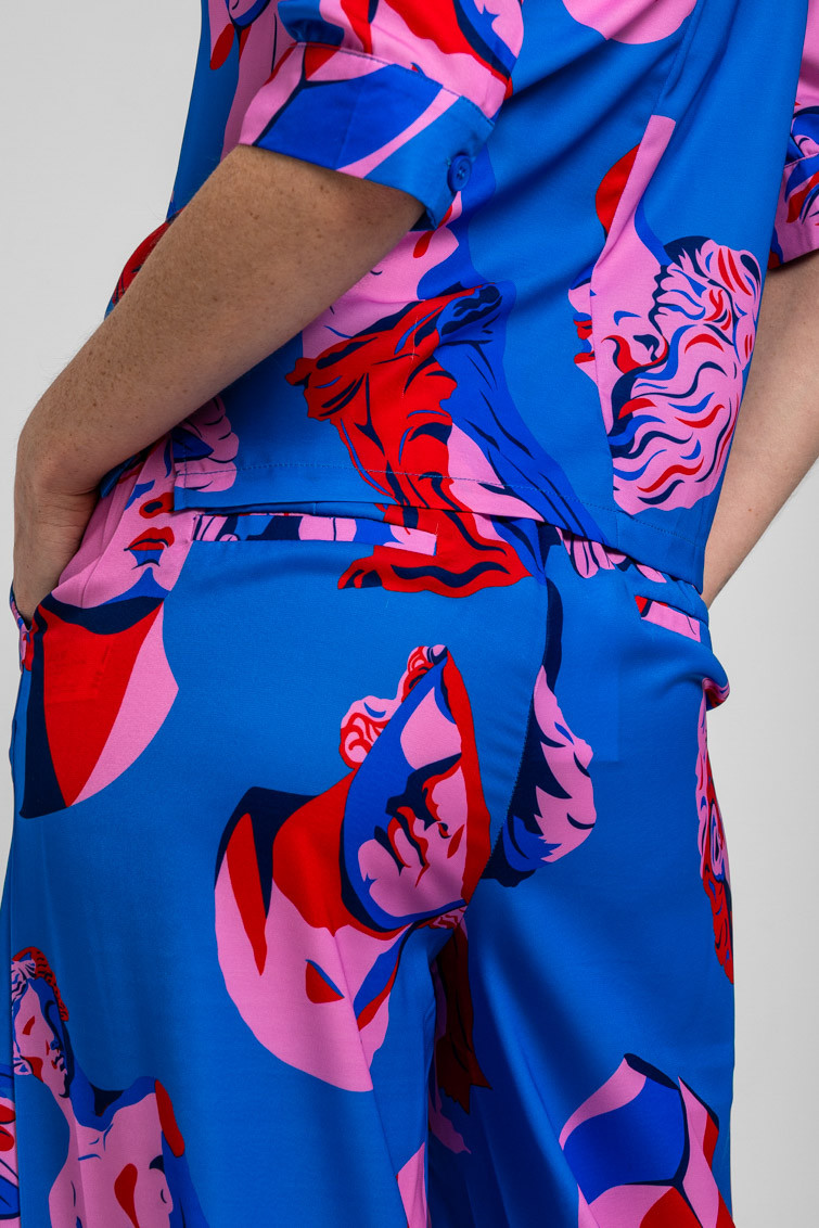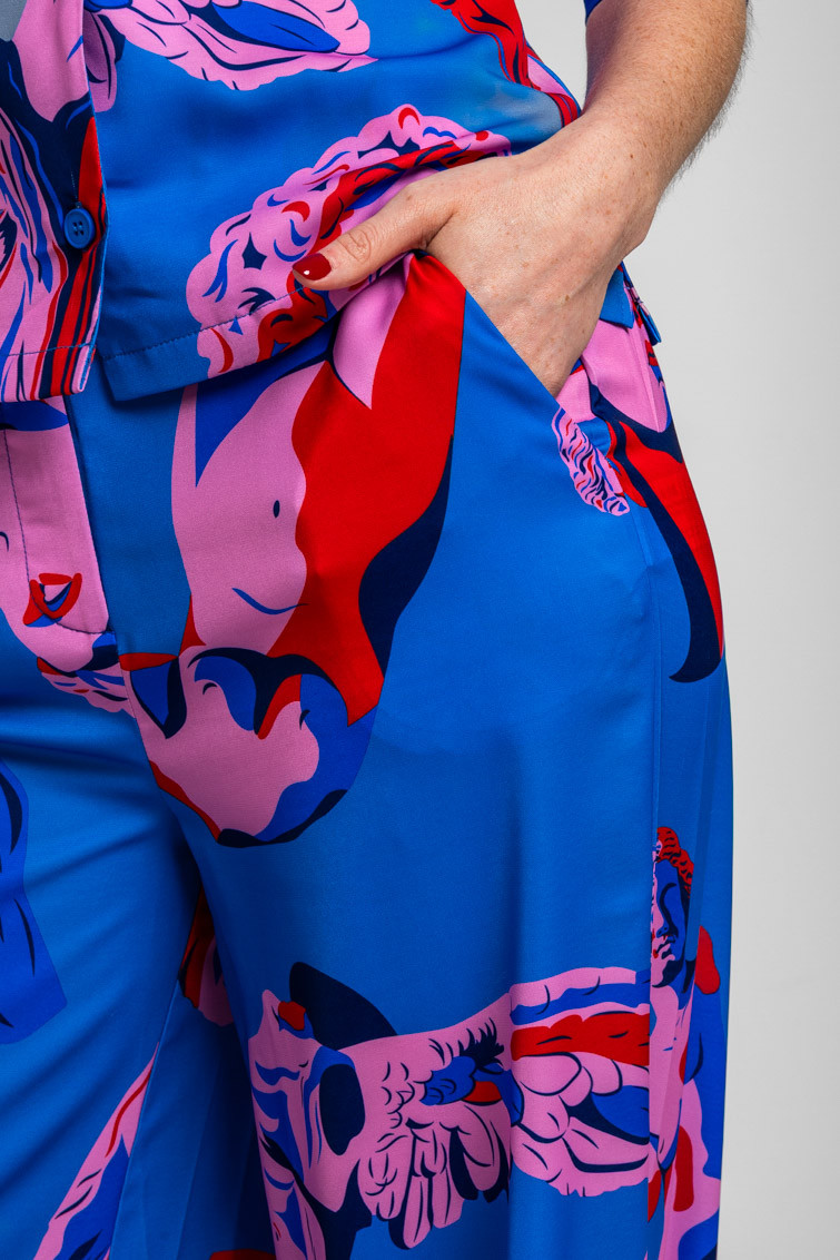 Pantalón sastre azul de esculturas clásicas rosas y rojas - Rompe el molde