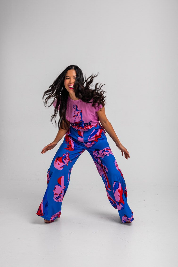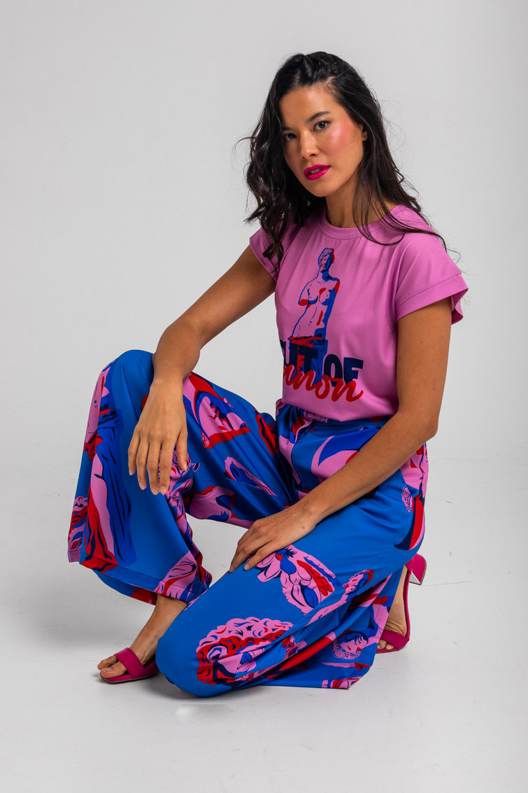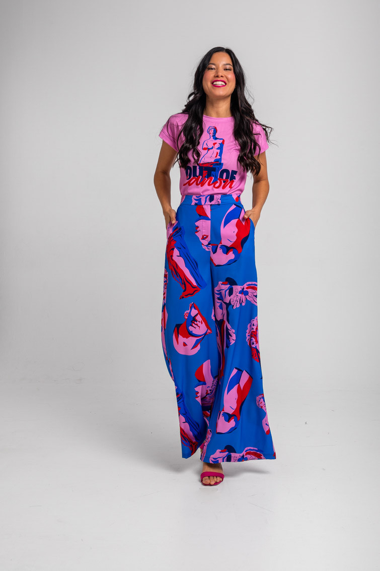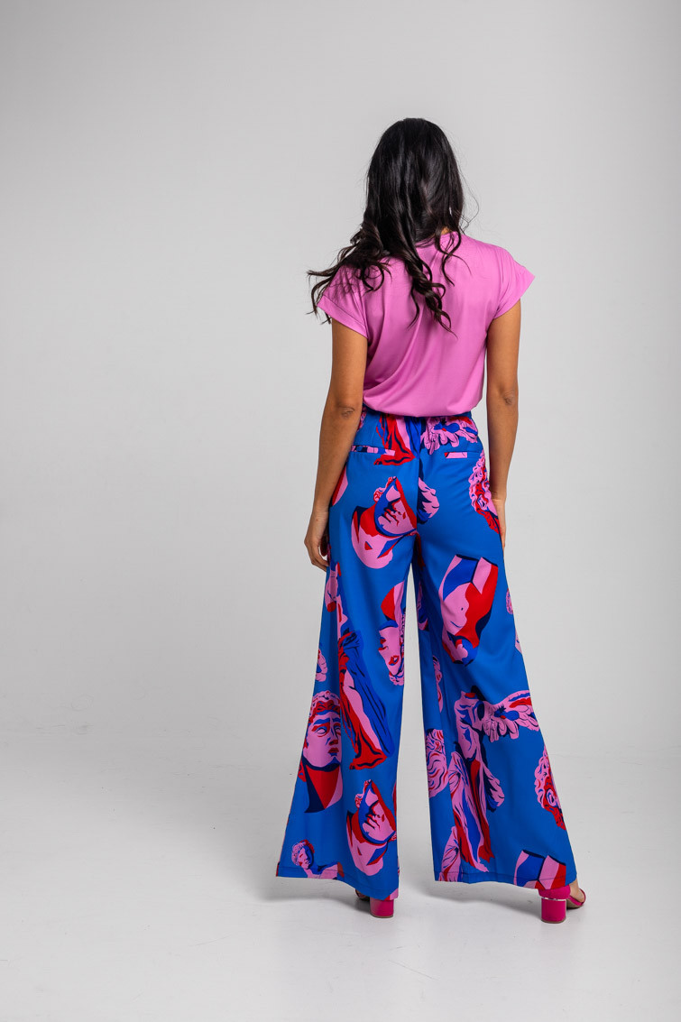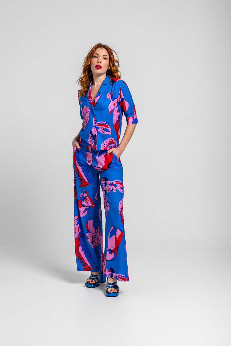 Pantalón sastre azul de esculturas clásicas rosas y rojas - Rompe el molde