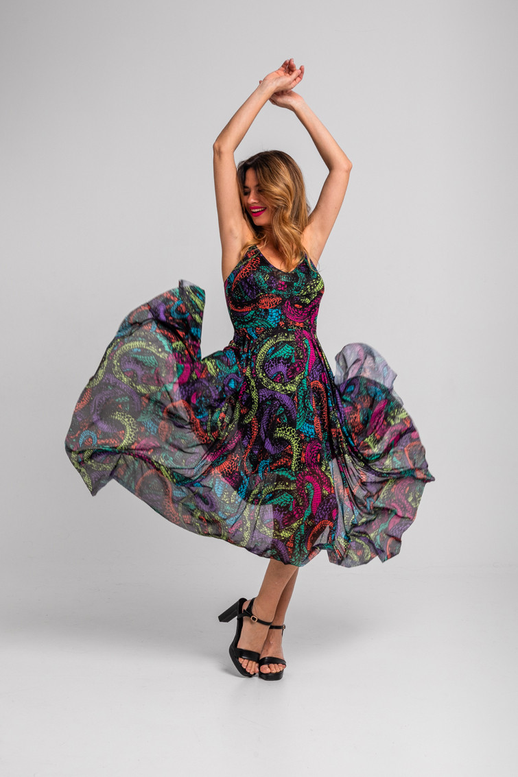 Veneno: dicen que tengo veneno en la piel - Vestido tirantes de tul largo de corte pañuelo de serpientes: Vestido midi en tul elástico con cuerpo entallado en cintura, escote con forma de pico en pecho, costura bajo el busto y con tirantes finos espagueti. Modelo diseñado con el bajo asimétrico y con un ligero vuelo. - 95% Poliéster y 5% Elastán. - Lavar a máquina en agua fría. No usar blanqueador. No usar secadora. Secar colgado a la sombra. Planchado a temperatura baja, por debajo de 100 ºC. Planchar del revés. No dejar la plancha parada sobre la prenda. Lavar con colores similares. - TALLA XS: Medida de pecho 40 cm, medida de la cintura 35 cm, medida de la cadera 41 cm y largo del cuerpo 121,5 cm.TALLA S: Medida de pecho 42 cm, medida de la cintura 37 cm, medida de la cadera 43 cm y largo del cuerpo 123 cm.TALLA M: Medida de pecho 44 cm, medida de la cintura 39 cm, medida de la cadera 45 cm y largo del cuerpo 124,5 cm.TALLA L: Medida de pecho 46 cm, medida de la cintura 41 cm, medida de la cadera 47 cm y largo del cuerpo 126 cm.TALLA XL: Medida de pecho 48 cm, medida de la cintura 43 cm, medida de la cadera 49 cm y largo del cuerpo 127,5 cm.TALLA XXL: Medida de pecho 50 cm, medida de la cintura 45 cm, medida de la cadera 51 cm y largo del cuerpo 129 cm. - Las medidas de las prendas pueden presentar pequeñas variaciones debido al proceso de producción de hasta 2 cm. - Lolina ha realizado un gran esfuerzo para mostrar los colores de las prendas de la forma más cercana a la realidad posible. No obstante, queremos que tengas en cuenta que el color de las prendas que aparecen en pantalla puede estar sujeto a variaciones dependiendo de la calidad de tu ordenador o smartphone.