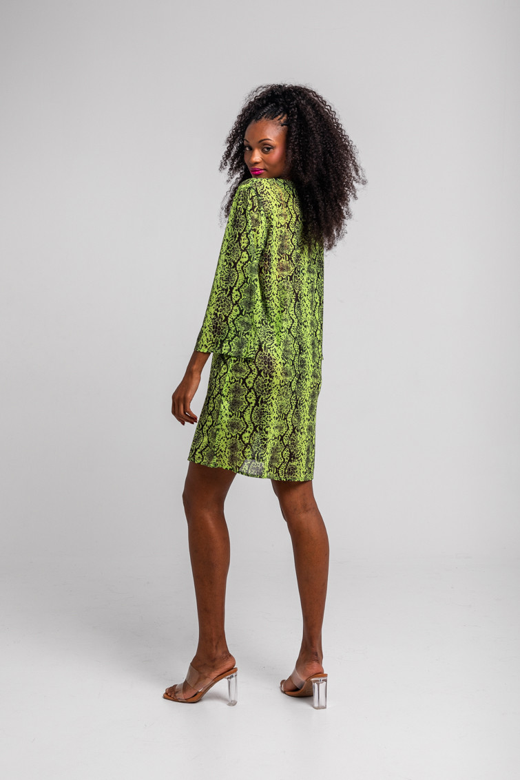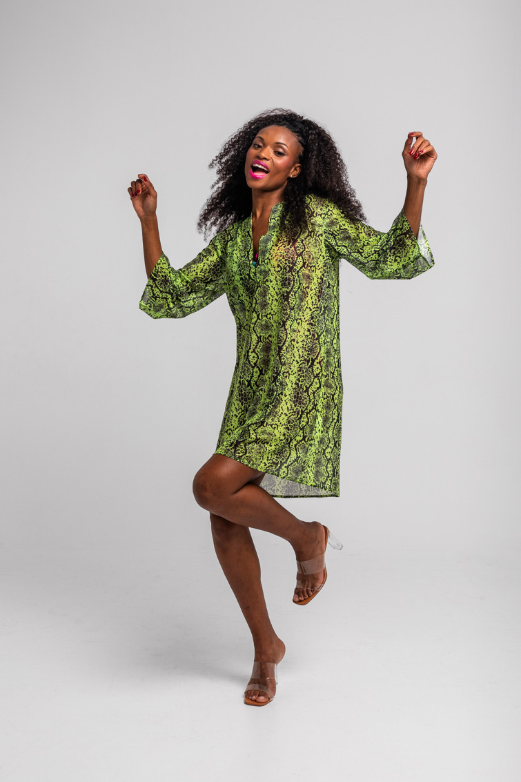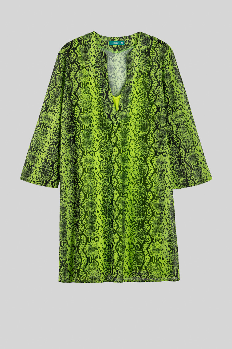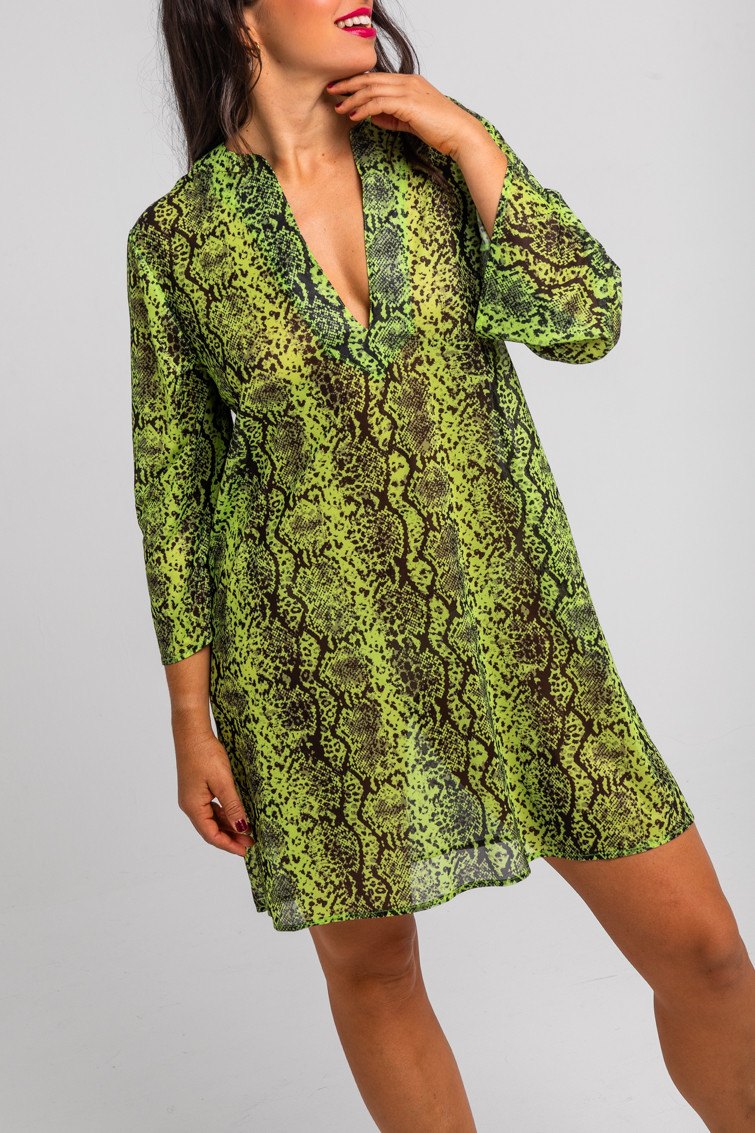 Snake: serpenteando por la vida - Kaftan corto Serpientes animal print lima: Vestido de corte kaftan corto en tejido fluido ligero y manga amplia. Diseñado con escote pico pronunciado y corte holgado. - 95% Poliéster y 5% Elastán. - Lavar a máquina en agua fría. No usar blanqueador. No usar secadora. Secar colgado a la sombra. Planchado a temperatura baja, por debajo de 100 ºC. Planchar del revés. No dejar la plancha parada sobre la prenda. Lavar con colores similares. - TALLA XS: Medida de pecho 50 cm, medida de la cintura 51 cm, medida de la cadera 53 cm y largo del cuerpo 86.5 cm.TALLA S: Medida de pecho 52 cm, medida de la cintura 53 cm, medida de la cadera 55 cm y largo del cuerpo 88 cm.TALLA M: Medida de pecho 54 cm, medida de la cintura 55 cm, medida de la cadera 57 cm y largo del cuerpo 89.5 cm.TALLA L: Medida de pecho 56 cm, medida de la cintura 57 cm, medida de la cadera 59 cm y largo del cuerpo 91 cm.TALLA XL: Medida de pecho 58 cm, medida de la cintura 59 cm, medida de la cadera 61 cm y largo del cuerpo 92.5 cm. - Las medidas de las prendas pueden presentar pequeñas variaciones debido al proceso de producción de hasta 2 cm. - Lolina ha realizado un gran esfuerzo para mostrar los colores de las prendas de la forma más cercana a la realidad posible. No obstante, queremos que tengas en cuenta que el color de las prendas que aparecen en pantalla puede estar sujeto a variaciones dependiendo de la calidad de tu ordenador o smartphone.