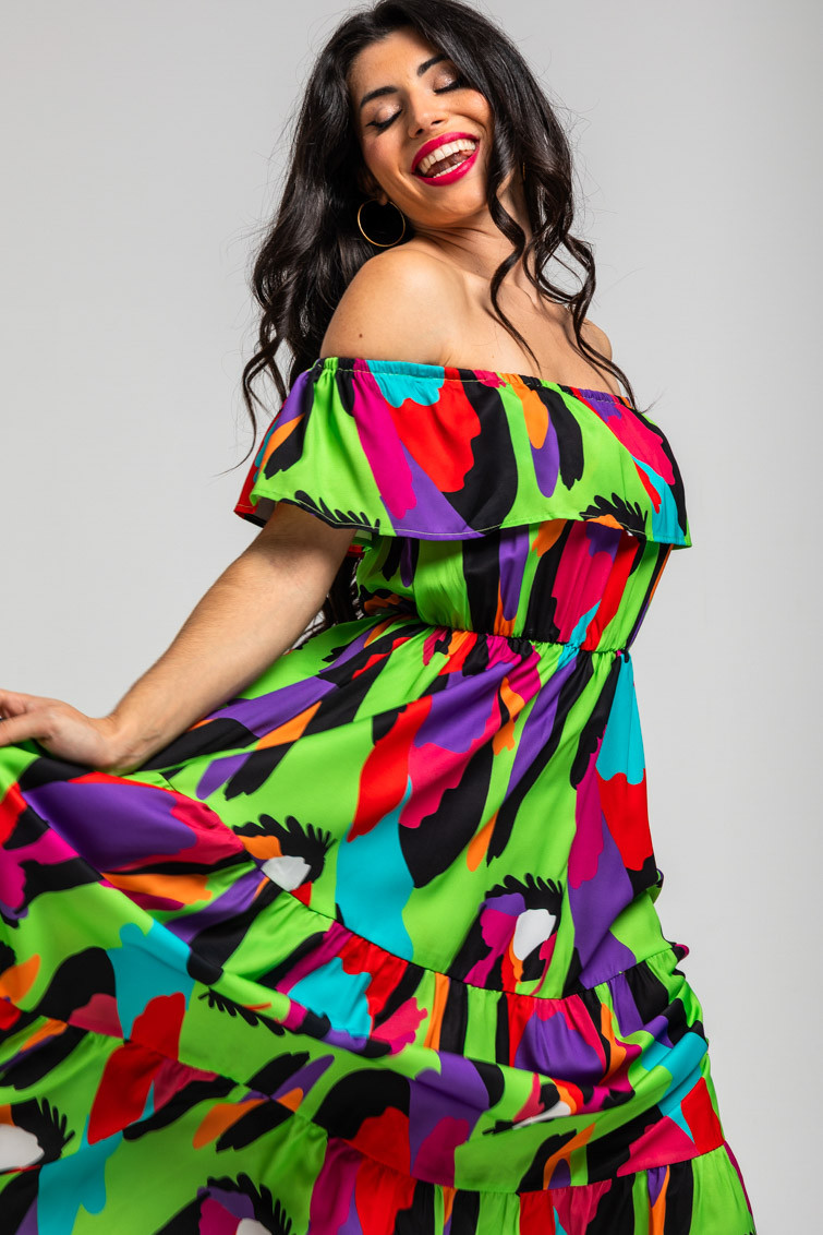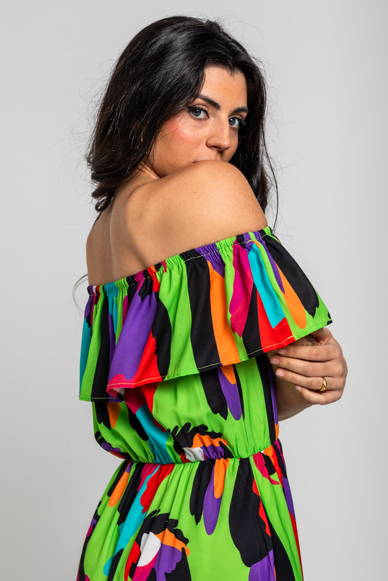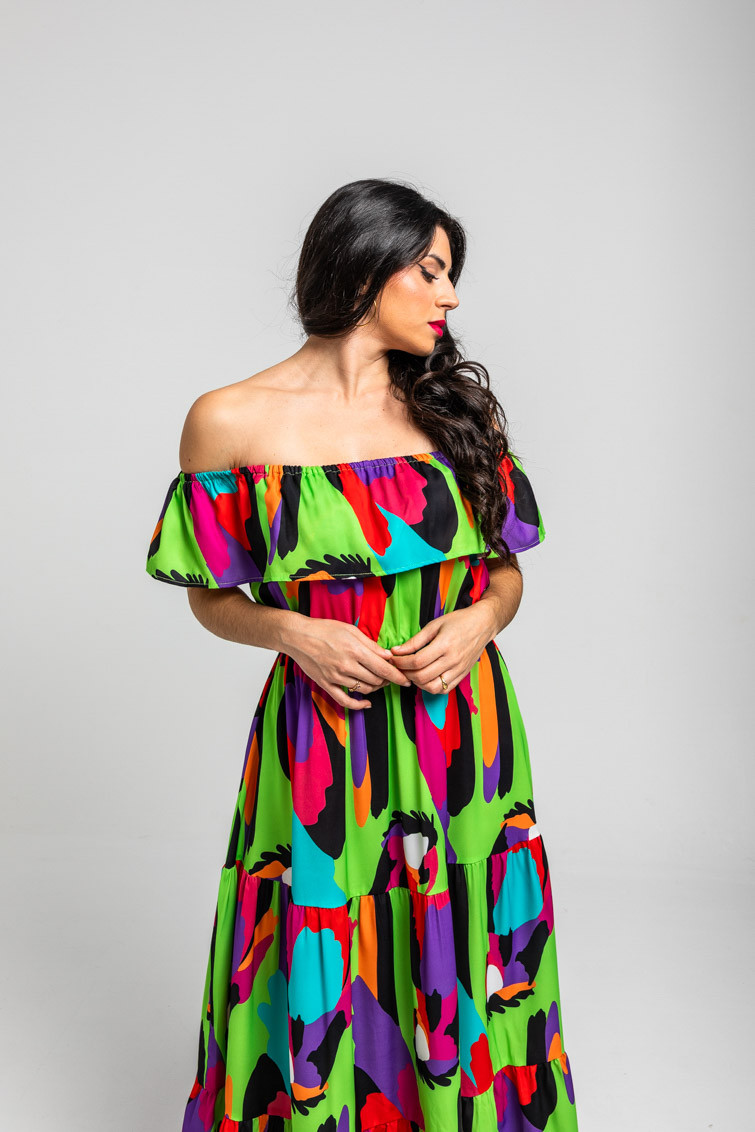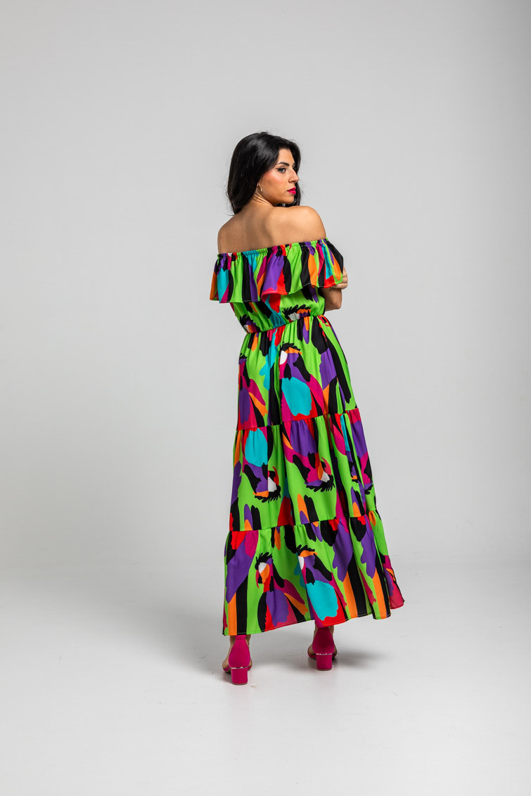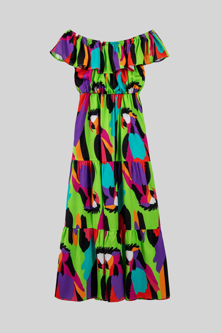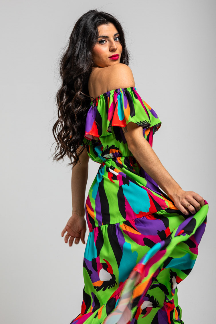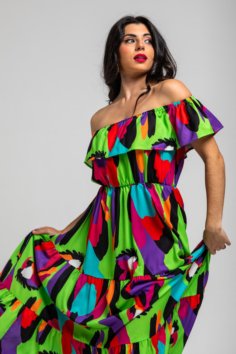 Vestido largo escote volante verde de loros - Al Loro