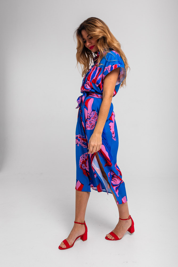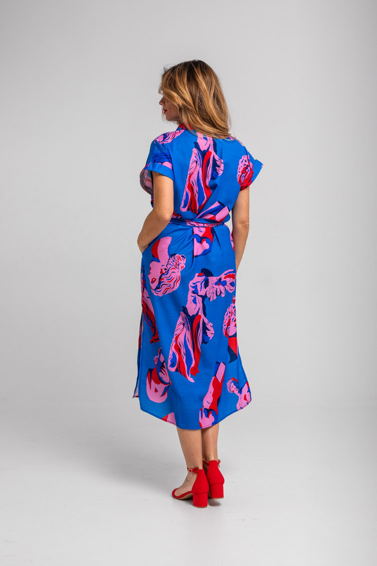 Camisero midi sin mangas azul de esculturas clásicas rosas y rojas - Rompe el molde