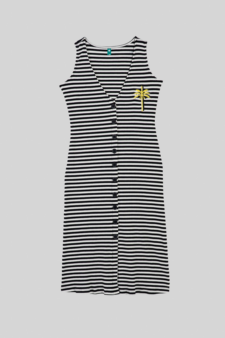 Vestido midi canalé sin mangas abotonado de raya blanca y negra con palmera bordada - La Faraona