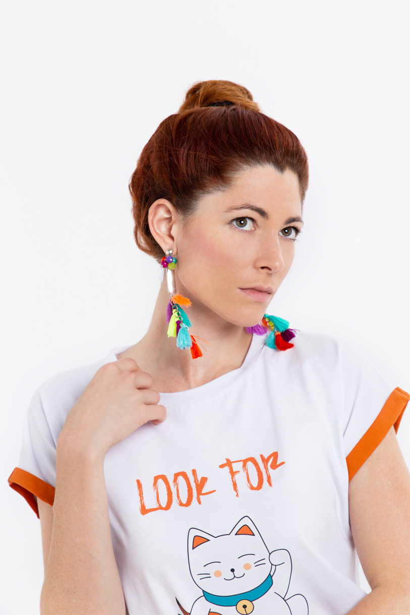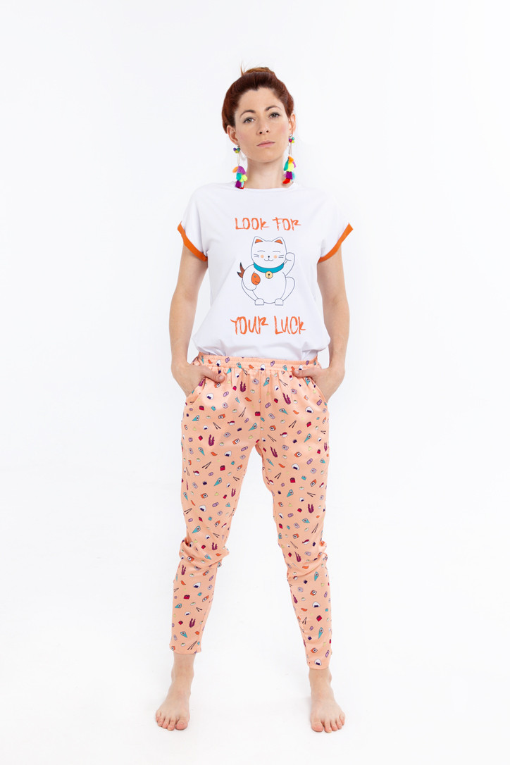 Sushi Orgie: Collection pour toxicomanes de sushis! · T-shirt de coton à 95% et 5% de spandex avec chat de la chance chinois. · Col rond. · Manches courtes orange. · Le modèle porte la taille et mesure 170 cm. Composition et lavage de la machine à laver à l'eau froide. N'utilisez pas d'eau de Javel. N'utilisez pas de sèche-linge. Suspendu sec à l'ombre. Repassage à la température maximale de la plaque intérieure de 110º. Laver avec des couleurs similaires. Composition: 95% coton 5% spandex. Couleur blanche.