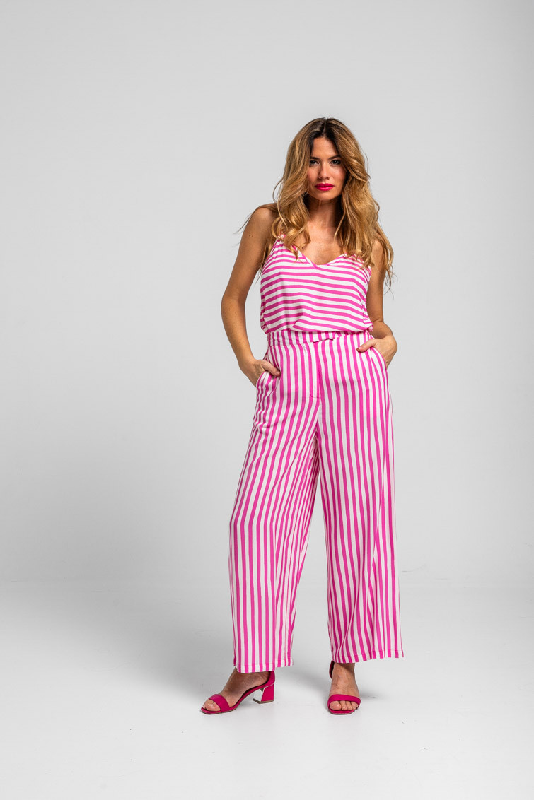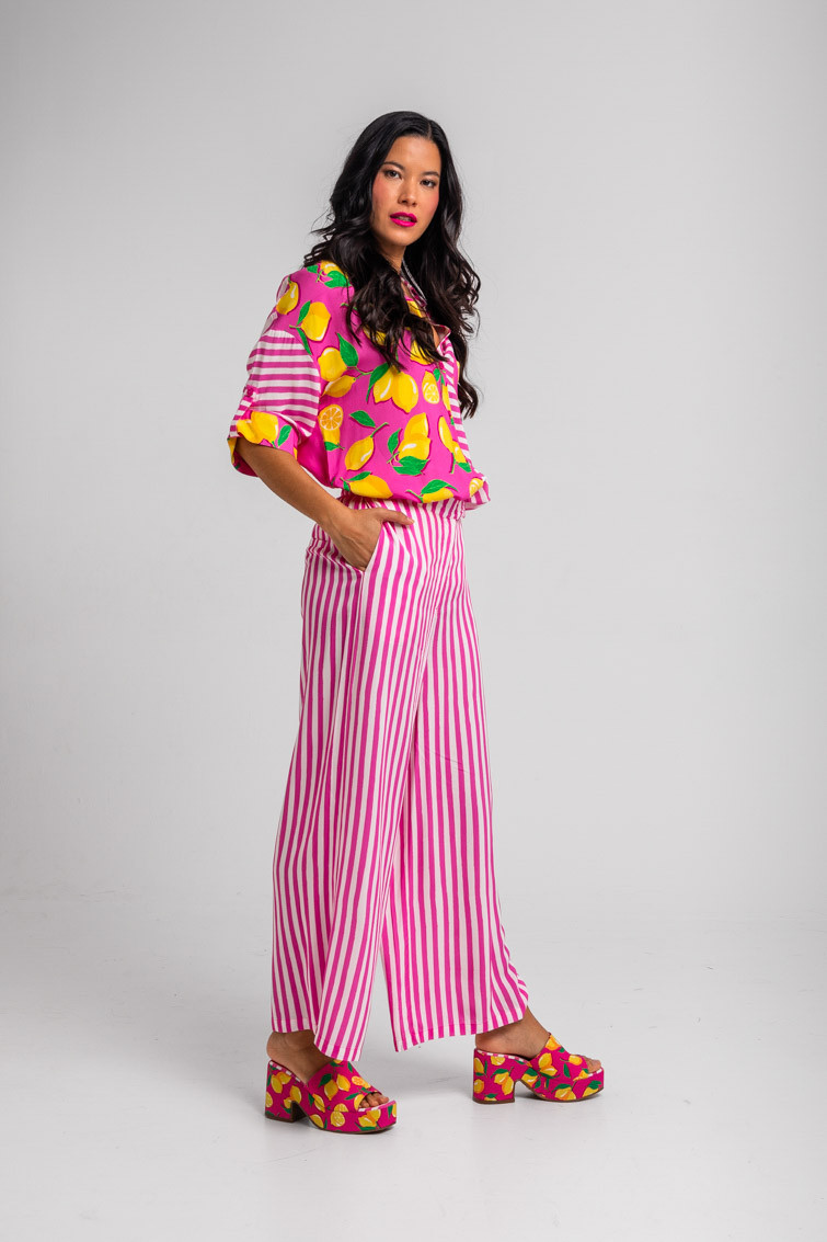 Limoncello: ácido, rico y cargadito - Pantalón culotte de rayas blancas y rosas: Pantalón de tiro alto con bolsillos delanteros, falsos bolsillos en espalda, pernera ancha y cierre frontal con cremallera, botón interior y gancho. - 100% Viscosa. - Lavar a máquina en agua fría en centrifugado corto. No usar blanqueador. No usar secadora. Secar colgado a la sombra. Planchado a temperatura baja, por debajo de 100 ºC. Planchar del revés. No dejar la plancha parada sobre la prenda. Lavar con colores similares. - TALLA XS: Medida de la cintura 32 cm, medida de la cadera 44 cm y largo del cuerpo 96 cm.TALLA S: Medida de la cintura 34 cm, medida de la cadera 46 cm y largo del cuerpo 96 cm.TALLA M: Medida de la cintura 36 cm, medida de la cadera 48 cm y largo del cuerpo 96 cm.TALLA L: Medida de la cintura 38 cm, medida de la cadera 50 cm y largo del cuerpo 96 cm.TALLA XL: Medida de la cintura 40 cm, medida de la cadera 52 cm y largo del cuerpo 96 cm.TALLA XXL: Medida de la cintura 42 cm, medida de la cadera 54 cm y largo del cuerpo 96 cm. - Las medidas de las prendas pueden presentar pequeñas variaciones debido al proceso de producción de hasta 2 cm. - Lolina ha realizado un gran esfuerzo para mostrar los colores de las prendas de la forma más cercana a la realidad posible. No obstante, queremos que tengas en cuenta que el color de las prendas que aparecen en pantalla puede estar sujeto a variaciones dependiendo de la calidad de tu ordenador o smartphone.